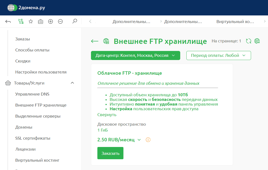 Облачный диск с нужным объемом можно заказать в считанные минуты в Личном Кабинете, для этого выберите раздел «Внешнее FTP хранилище», после укажите нужный объем хранилища (возможно расширить в будущем) и выполните оплату. Хранилище будет доступно в течении нескольких секунд после оплаты.