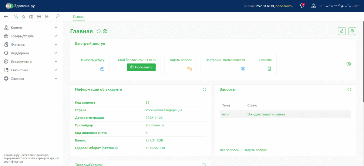 Личный кабинет клиента — раздел на сайте client.2domena.ru, где вы можете заказывать и управлять услугами, задавать вопросы в техподдержку и получать финансовые документы. Этот раздел документации поможет вам познакомиться с интерфейсом личного кабинета.
