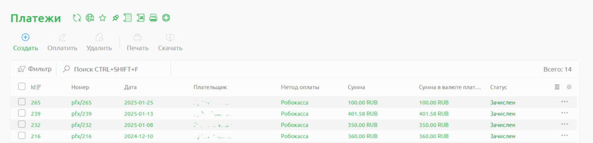 Оплаченный счёт вы найдёте в разделе Финансы → Платежи. Когда оплата поступит, статус счёта изменится с «Новый/Оплачивается» на «Зачислен».