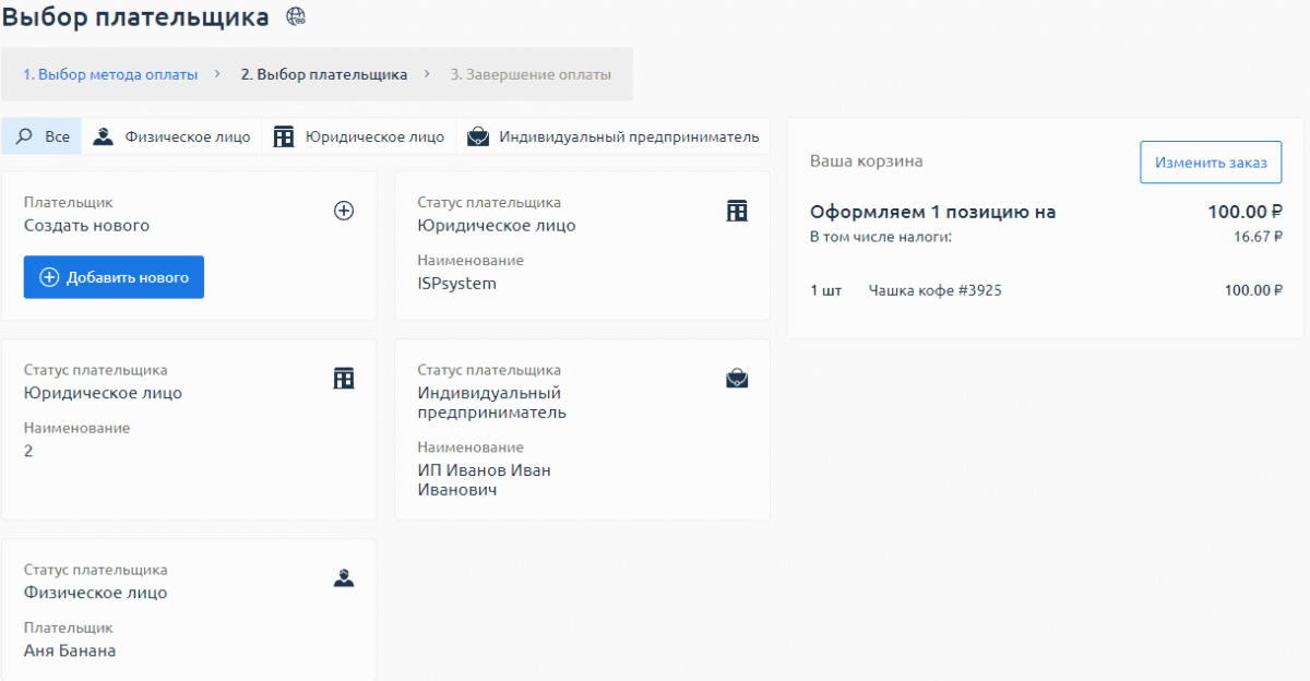 3. Выберите существующего плательщика или создайте нового. Укажите информацию о плательщике. В зависимости от выбранного метода оплаты этот шаг можно пропустить.